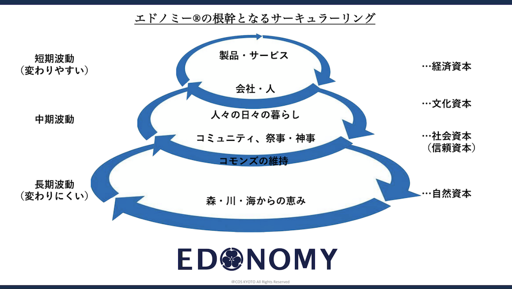 この考え方を軸に、北林さんが提唱するのが、江戸時代の社会を基盤とした「エドノミー」という考え方だ。その根幹となる「サーキュラーリング」は、自然の恵みの循環があり、それを守るための共同体(コモンズ)があり、その中で生活や文化、祭りが育まれ、結果として経済や社会が回るというモデル。現代で分断されてしまったこれらの要素を、もう一度つなぎ直すことを目指している。