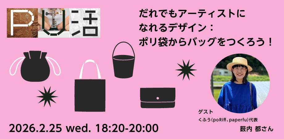 2/25(水)は、「だれでもアーティストになれるデザイン」として、ポリ袋を用いたアップサイクルプロダクト「poRiff」を展開する、くふう代表の薮内都さんとともに、世界で一つのバッグを作りたいと思います。