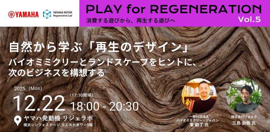 当社が運営する横浜の循環経済を促進するプラットフォーム「Circular Yokohama」は、12月22日にヤマハ発動機が開催するイベント「自然から学ぶ『再生のデザイン』。バイオミミクリーとランドスケープをヒントに、次のビジネスを構想する|PLAY for REGENERATION Vol.5」の企画・運営をサポートしています。「PLAY for REGENERATION」はヤマハ発動機が共創スペース「リジェラボ」からお送りするイベントシリーズで、遊びを通じて新規事業や共創の種を育むイベントを展開しています。